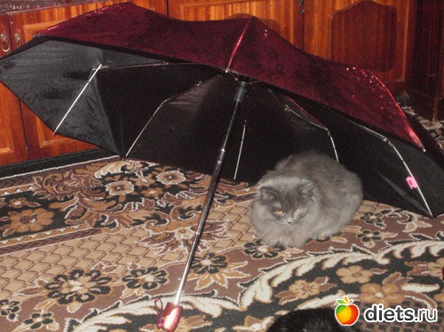 Причём вместе с прищепками. Прищепки слабые и она побоялась, что они попадают с балкона. И так как похолодало и пошли дожди, её любимым местом стало место под зонтом. А если красавица промокнет?