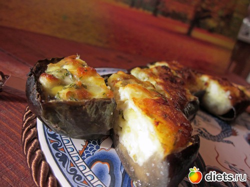 Берем небольшой баклажан, отвариваем в кипящей подсоленной воде 15-20 минут (зависит от размера баклажана). Вынимаем, остужаем. В это время смешиваем обезжиренный творог, сыр (в данном случае был козий... используйте тот, что по вкусу), яйцо, зелень + соль, перчик и зубчик чеснока.