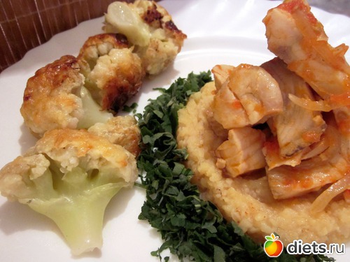 "Берем тарелку, мысленно делим ее на 4 части - одну часть заполняем белковой пищей (рыба), вторую часть - сложный углевод (чечевица), третью часть - волокнистый углевод (цветная капуста).