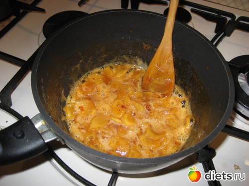 5) Затем варить на сильном огне, постоянно помешивая, пока сироп не загустеет, и его практически не останется (у меня он стал немного коричневатым).