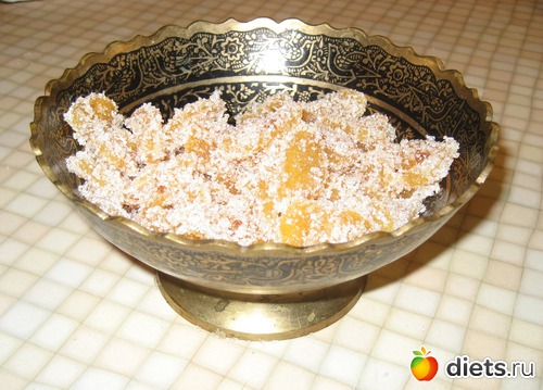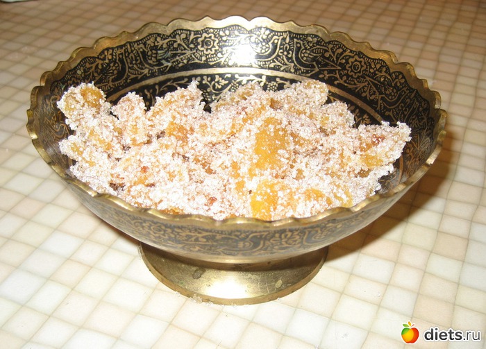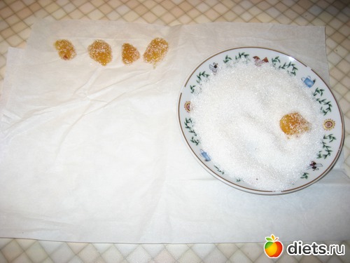 6) Достаем из сиропа каждый кусочек и обваливаем в сахаре (можно также в кокосовой стружке). Можно в сахар добавить немного лимонной кислоты. Оставшийся сироп добавьте в имбирный чай