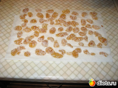 7) Далее выкладываем на бумагу для выпечки. Через 7-10 минут можно положить имбирь в конфетницу или контейнер с крышкой для хранения (до 3 месяцев)