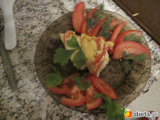 На пару приготовила курицу 20 минут (боялась что пригорит, так как готовлю всегда без масла), сняла посолила, выложила в мультиварку, сверху положила томат, не много сметаны и тертый сыр, запекала 20 минут.