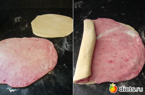 Затем раскатать сначала белое тесто, затем розовое. Положить один пласт на другой, завернуть рулетом.