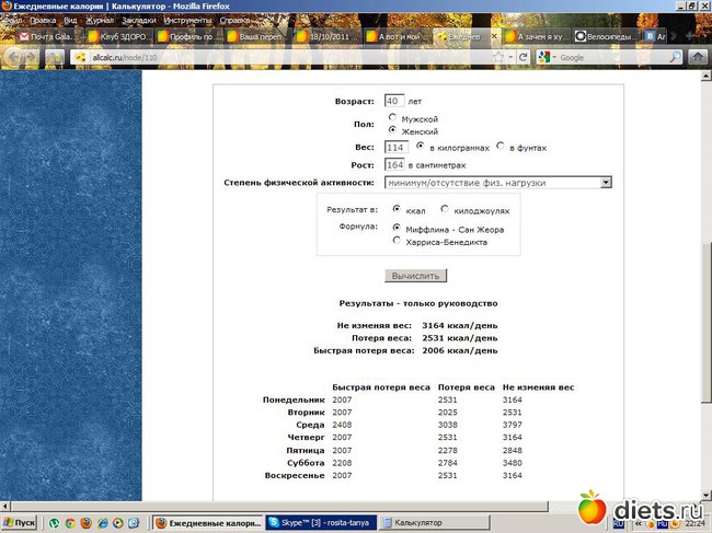 В подсчете калорий я, обычно, руководствуюсь счетчиками калорий на сайте в дневниках питания и спорта, поэтому очень сильно удивилась, увидев такой расчет. Наверно, нужно все-таки подумать насчет добавления калорийности, мне кажется, что вес достаточно быстро уходит. Я никуда не спешу и не собираюсь ставить рекорды сброса лишнего веса, мне важно, чтобы тело успевало адаптироваться к новым условиям.