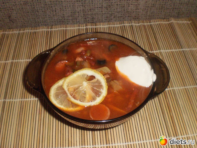 4. В тарелку с солянкой порезать оливки, лимончик, добавить сметану.