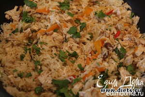 9Когда рис будет готов, добавить курицу и 2/3 нарубленной кинзы, влить соевый соус, перемешать и посыпать оставшейся кинзой.
