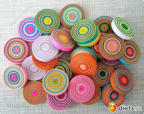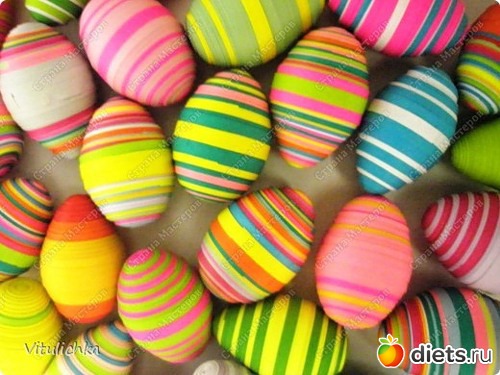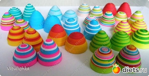 Для яиц подготовить шайбы из полос цветной бумаги. Для шайбы понадобится до 20 полос. Конец и начало полоски фиксировать клеем ПВА. Порядок чередования цветных полос должен быть одинаковым для двух шайб – двух половинок яйца.