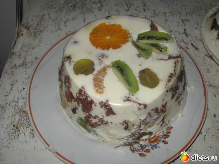 Торт фруктово-бисквитно-желейный, очень вкусный не сладкий, приятный и нежный.