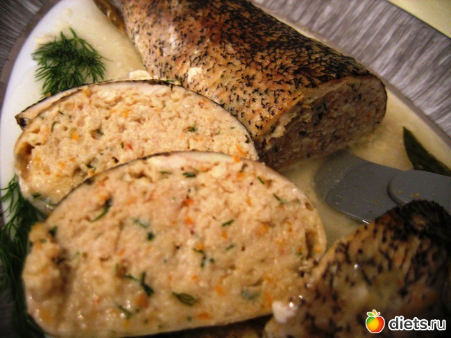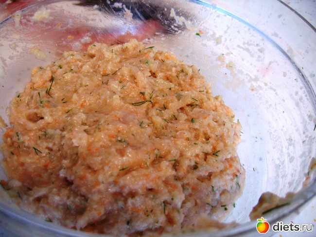 На мясорубке прокручиваем несколько раз филе щуки, хлеб, лук, натертую морковь. Затем в фарш добавляем укроп, яйцо, соль и специи по вкусу. Т. к. щука рыба постная, я в фарш добавила столовую ложку растительного масла.