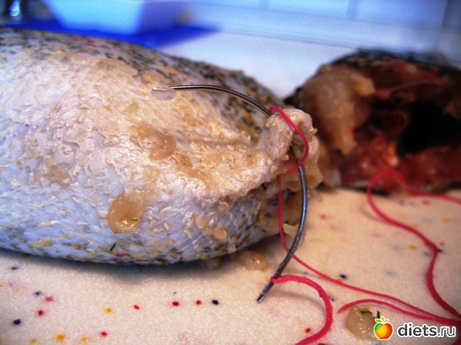 Затем аккуратно набиваем шкуру фаршем, набить не очень плотно, иначе при готовке шкура может лопнуть. Зашиваем.