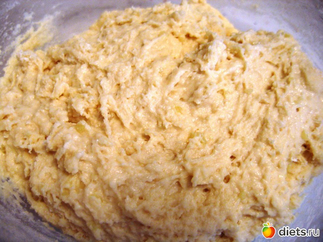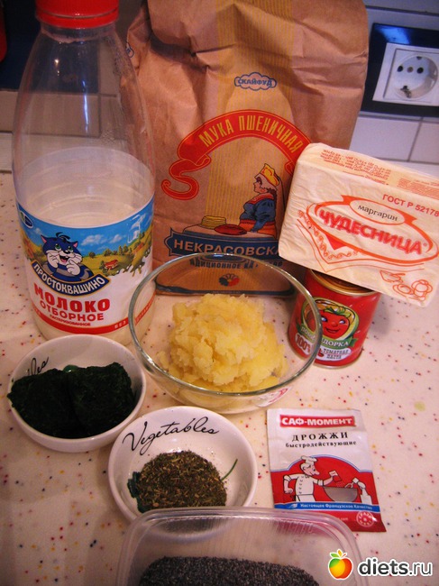 олоко подогреть, маргарин растопить, добавить пюре, разведенное отваром или водой. Перемешать, добавляем дрожжи, сахар и соль, постепенно вводим муку. Я замесила жидко, чтобы было удобно вмешивать добавки.