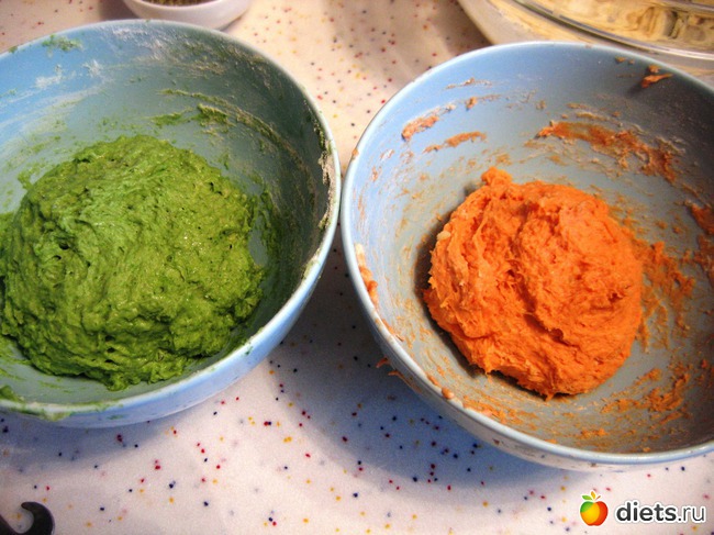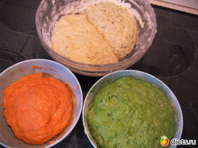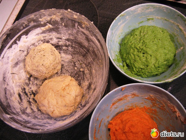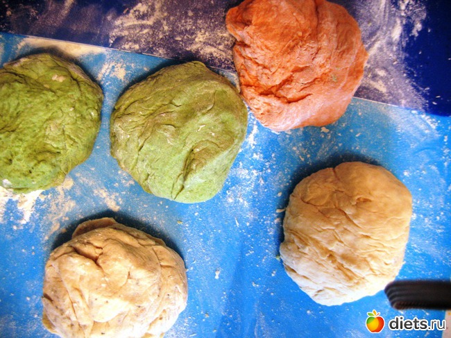 Из Общей массы берете часть теста, добавляет шпинат и еще муки и вымешиваете колобок.