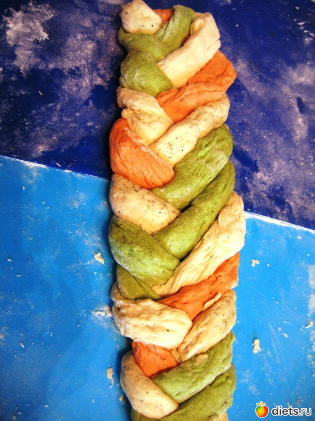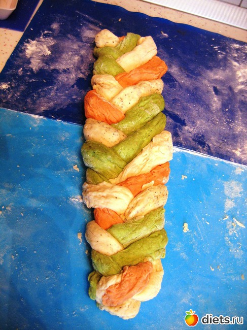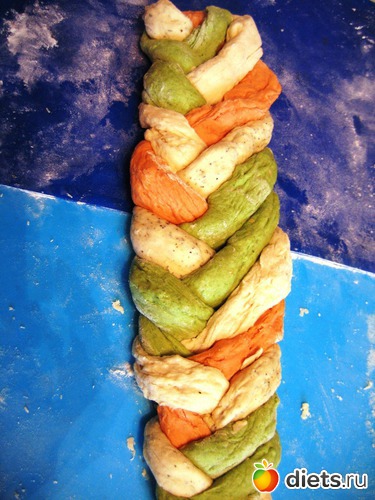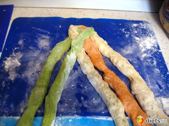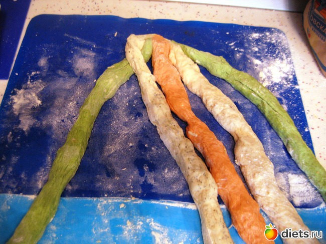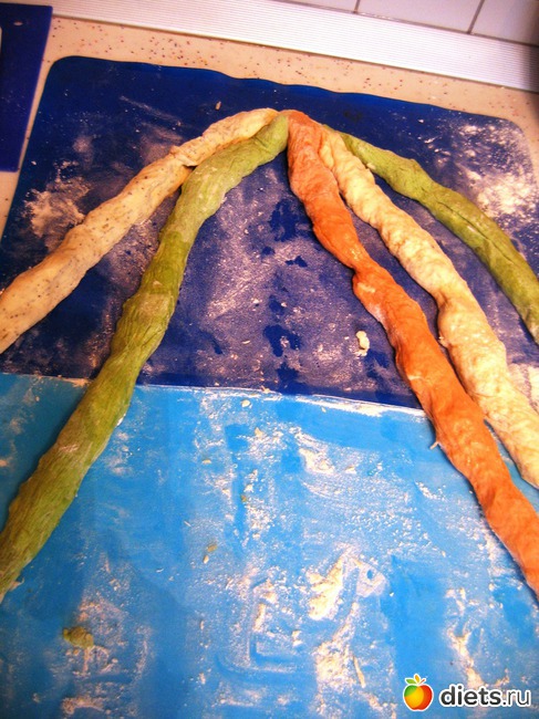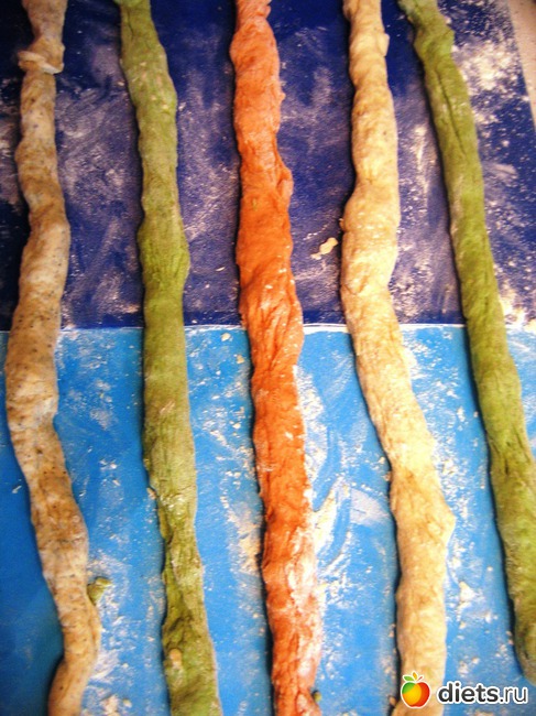 Через 1.5 часа берем тесто, каждый колобок на присыпанной мукой повернохности вымешиваем, потом формируем жгуты.