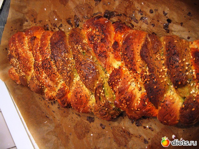 Выпекать минут 30-40 при температуре 180. Несмотря на то что хлеб получился большой, моему 40 минут было много, последние пять минут явно были лишними
