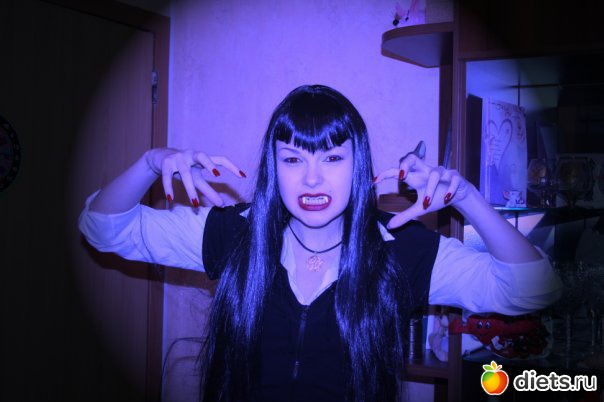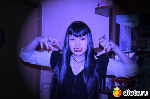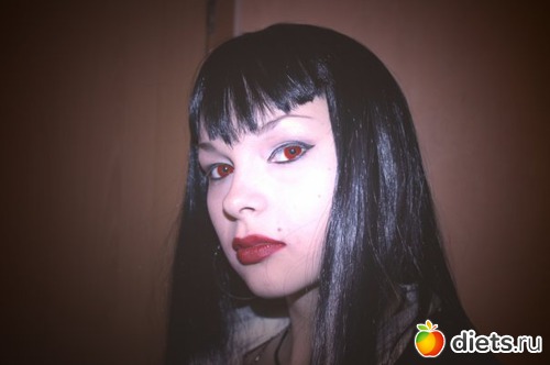 Тон совсем светлый и мерцающую перламутровую пудру, брови подведи почетче, и глаза!!! Стрелки под египет, и много черных теней, можно ресницы еще приклеить длиннющие..... Ну и естесственно кроваво-алые губы с стекающей каплющкой кровки.....