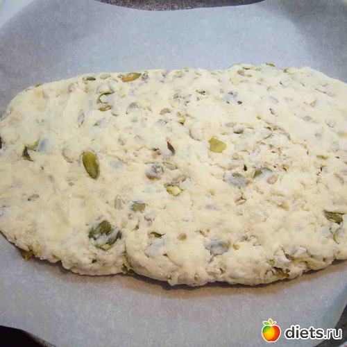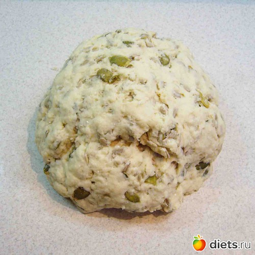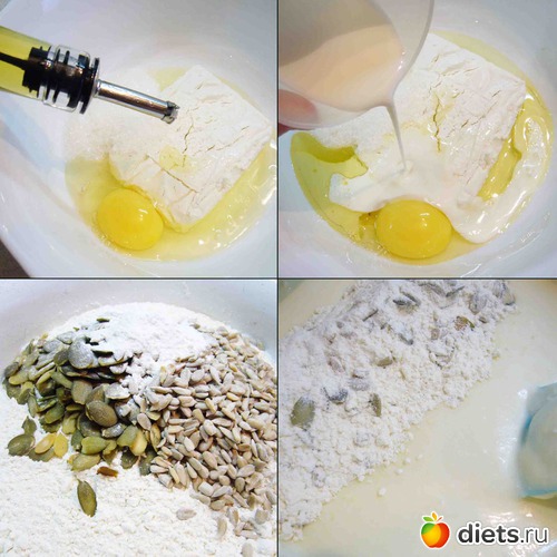 Тыквенные семечки - 50гр; семечки подсолнечные(очищенные) - 50гр; мука - 300гр; творог - 200гр; яйцо - 1шт; разрыхлитель - 1уп; сахар - 50гр; молоко - 50гр; масло подсолнечное - 2ст. л.