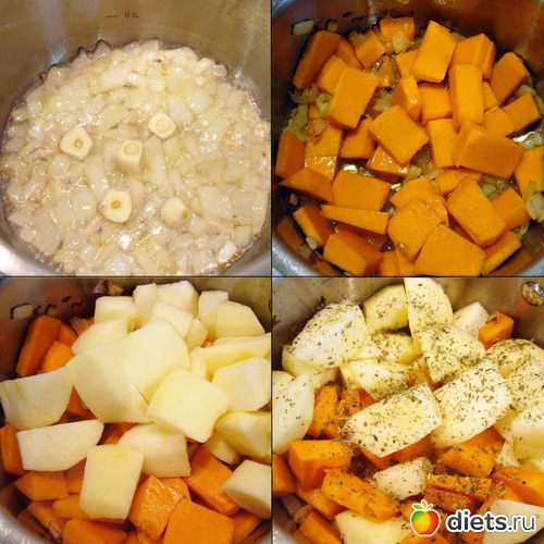 В небольшом количестве оливкового масла, я обжарила мелко нарезанный репчатый лук до золотистой корочки. Добавила чеснок, и очищенную тыкву нарезанную на средние кусочки. Яблоки я очистила и порезала на средние кусочки, добавила их к тыкве. Посолила, поперчила, добавила прованские травы.