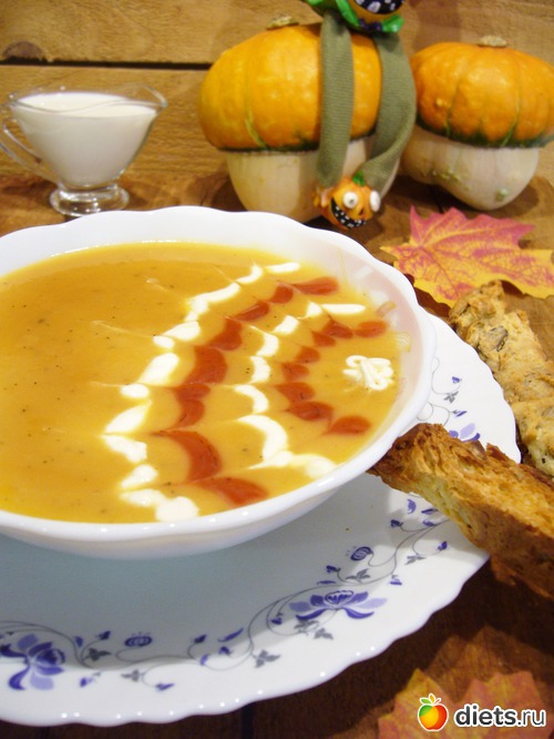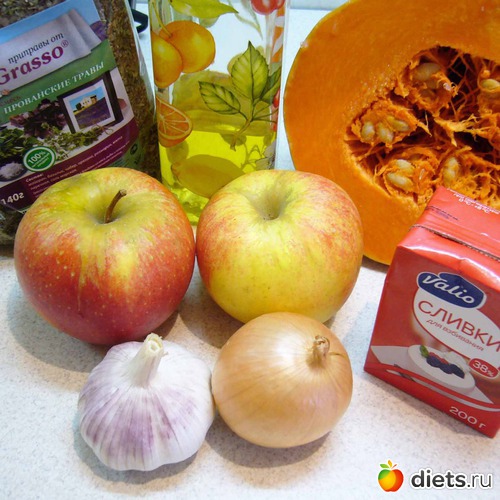 Тыква - 250гр; яблоко - 2шт; лук репчатый - 1шт; чеснок - 2зуб; соль, перец(по вкусу); лавровый лист - 1шт; смесь прованских трав(по вкусу); масло оливковое(для жарки) ; сливки 100мл; вода - 200мл.