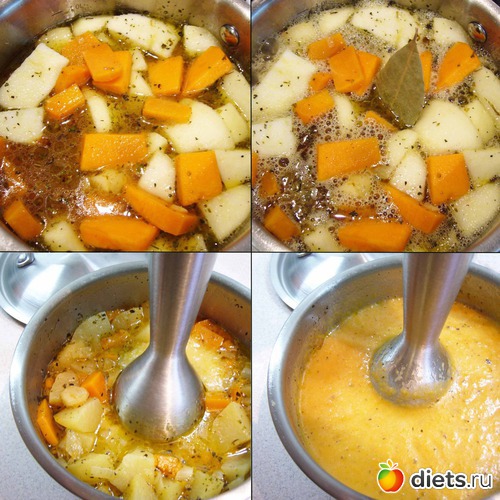Добавила воду, лавровый лист и варила все до готовности тыквы на среднем огне примерно 15-20минут. Затем при помощи блендера пропюрировала суп. Затем в суп добавила сливки и варила еще около 5 минут.