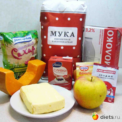тыква - 250гр; молоко - 125мл; дрожжи(сухие) - 7гр; сахар - 3ст. л; масло сливочное - 100гр; ванильный сахар - 1пак; мука - 450гр; соль - 1щеп.