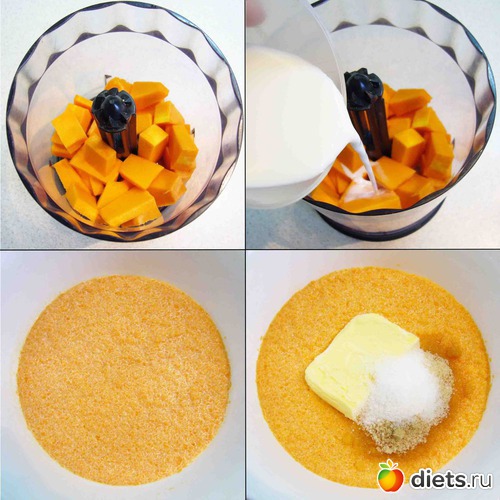 Я очистила тыкву от семян и кожуры. Нарезала на средние кусочки и поместила в блендер. Добавила к тыкве молоко и все измельчила. Поместила размельченную тыкву в большую и удобную для смешивания емкость и добавила сахар, ванильный сахар и сливочное масло.