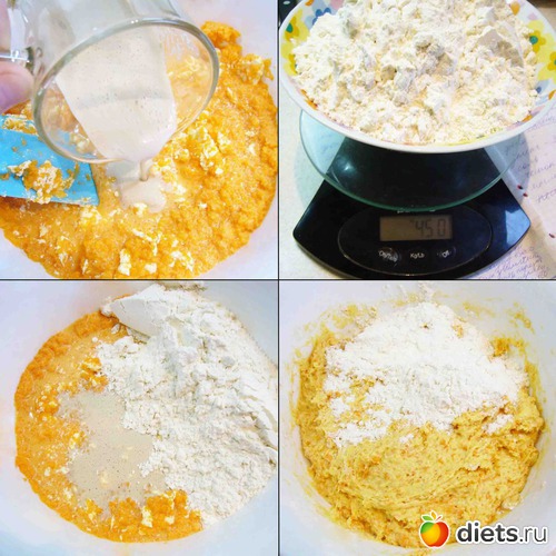 В отдельной емкости разбавила дрожжи с небольшим количеством теплой воды. Когда дрожжи немного поднялись, я добавила их к тыкве. Затем я добавила муку и все тщательно перемешала.