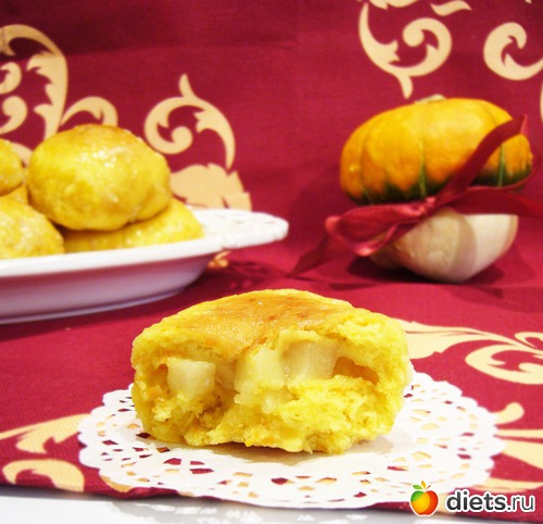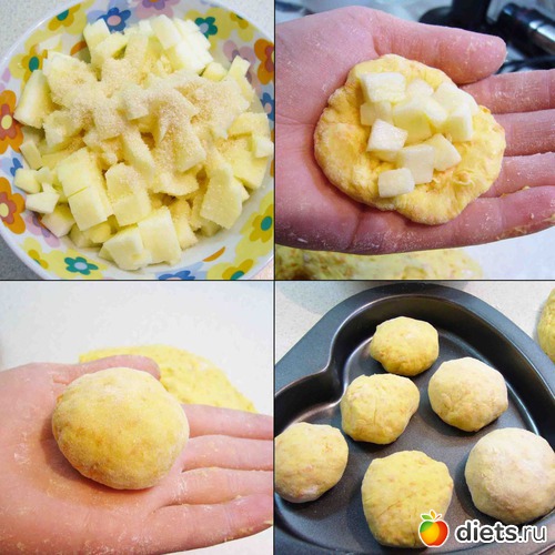 Яблоки я очистила от кожуры и нарезала на маленькие кубики. Затем посыпала сахаром и все перемешала. на лепешечку помещала немного яблочной начинки и сформировавала шарики. На противень выкладывала шарики и выпекала до золотистого цвета.