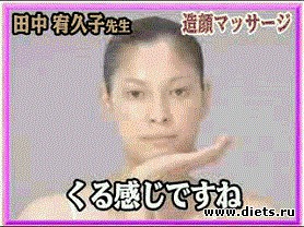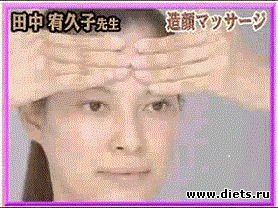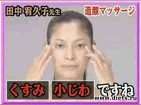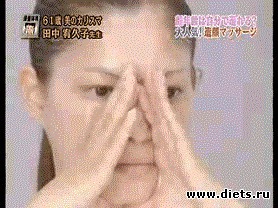 Поднимите руки к лицу, разведите локти в стороны параллельно полу. Поставьте подушечки средних пальцев у внешних уголков глаз (у японцев это - "хвост рыбы") и легко, без нажима, ведите их к внутренним углам глаз (к "голов рыбы"). Теперь остановитесь возле внутренних углов глаза (знаменитые точки красоты). Теперь немного увеличьте нажим и очертите полусферу вдоль радиуса по верхней глазничной кости к внешним углам глаз и на 3 секунды зафиксируйте пальцы у висков. Снова ослабьте нажим и едва касаясь кожи, «дорисуйте» круг под нижним веком снова к внутренним углам глаз, вернитесь к точкам красоты.