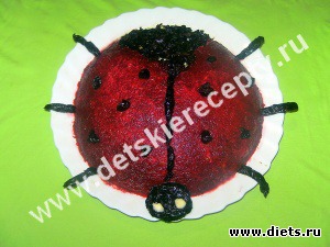 Оригинально оформленные салаты в виде разных зверушек нравятся всем детям. Салат «Божья коровка» готовится довольно просто и быстро, но выглядит очень привлекательно, врятли ребенок откажется попробовать такой салатик