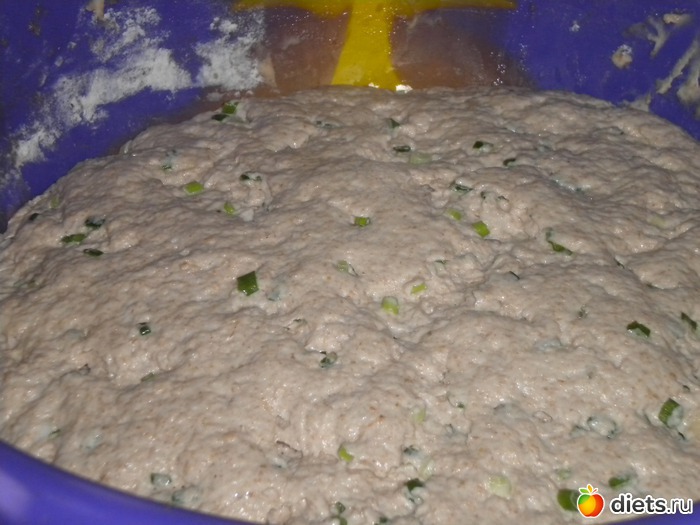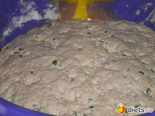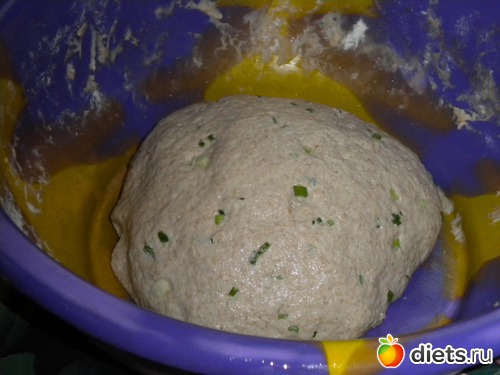 и замесила тесто, гладкое, но все-таки, чуть липнущее(руки смазывала растительным маслом). Нарезала мелко зеленый лук и добавила в тесто