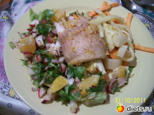 В тарелочке рыбка с овощами тушеная (в азиатском стиле) и салат из апельсинов и редиски, очень к рыдке подходит!!!