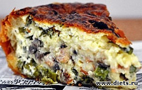 Выложить на тесто начинку: бОльшую часть шпината, грибы с чесноком и луком, бекон. Сверху положить кусочки сыра бри и залить все яичной смесью. Сверху выложить оставшиеся шпинат.
