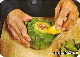 Отрезать грубые концы артишоков, оставив только их нежную часть. Отстричь ножницами острые кончики листьев и уложить в миску с водой, подкисленной лимонным соком.