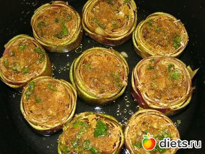 Слить воду с артишоков. Отвернуть листья в середине этого овоща и вынуть сердцевину с помощью маленькой ложечки. В углубления плотно уложить приготовленный ранее фарш. Завернуть листья обратно и обвязать артишоки ниткой, чтобы фарш не вытек во время приготовления. В глубоком противне подогреть остаток растительного масла. Разложить в нем артишоки вверх хвостиком и залить кипящим куриным бульоном, чтобы он покрывал артишоки. Для того чтобы кончики артишоков не подгорели, прикрыть их фольгой и поставить противень в горячую духовку на 40 минут.