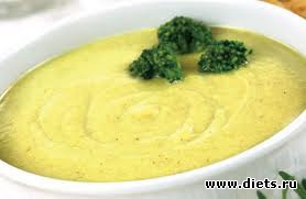 При подаче в суп положить вареное куриное филе, нарезанное кубиками, и нарезанные листики вареного шпината.