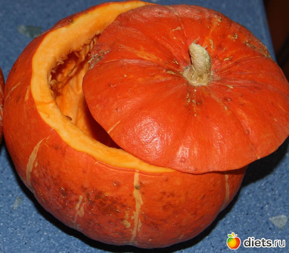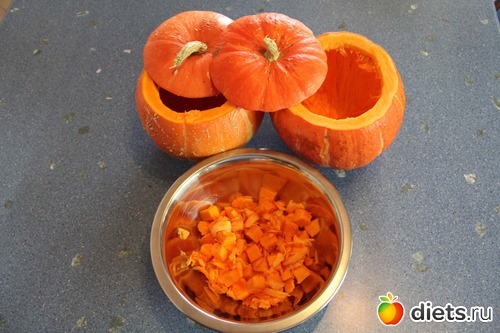 Две тыквочки. Крышечки срезала, семечки вынула. Толщину стенок оставила приблизительно 1см, остальное порезала в мисочку.