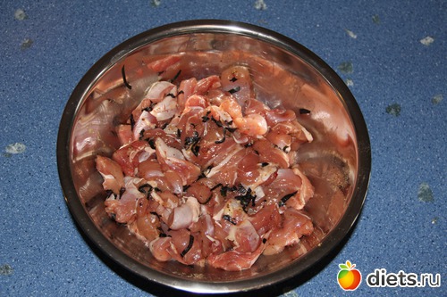 Куриные ножки освободила от косточки и кожи. Порезала и замариновала со специями.