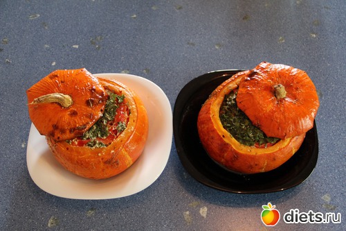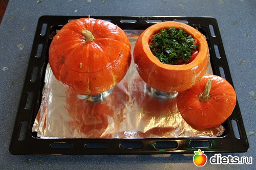 Чесночком натерла внутренности тыковок, выложила мясо, морковку, лук, перец ярусами. Соль, перец по вкусу. Не удержалась и добавила 10% сливок. посыпала зеленью. Накрыла крышечками, зафиксировала зубочистками. Вот что получилось: