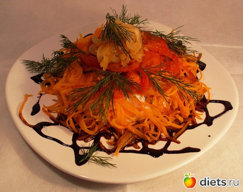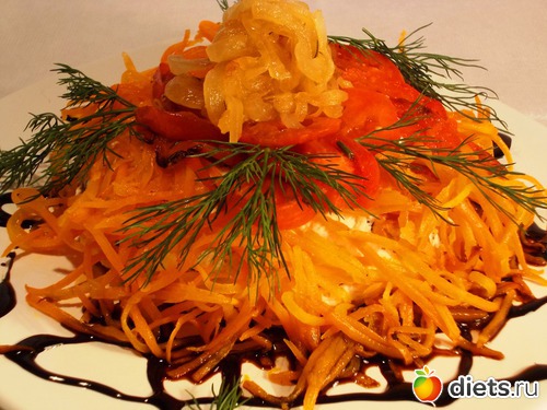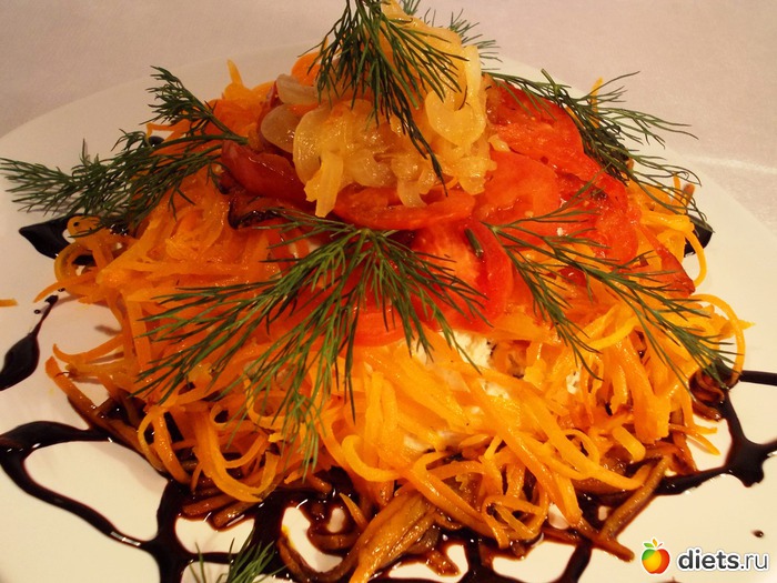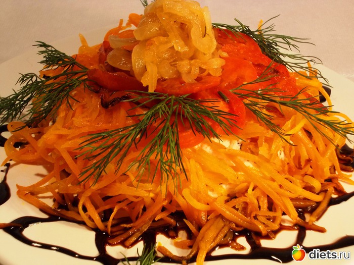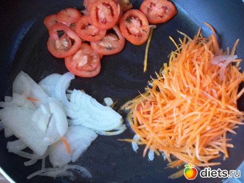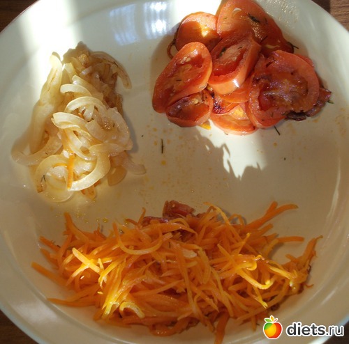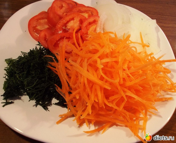 Лук нарезаем полукольцами, морковь на тёрке (у меня как по-корейски), томаты режем колечками. Половину пучка зелени мелко шинкуем.