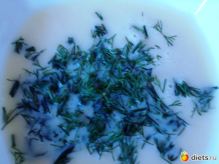 Наливаем яйца с молоко и зеленью в подходящую (жаростойкую) емкость. Вся прелесть этого омлета, в том, что ему можно придать любую форму (смотря в какую ёмкость вы его поместите).