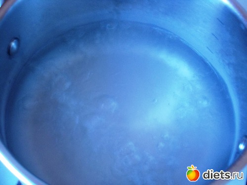 Ставим ёмкость с омлетом в кастрюлю с водой (надо, чтобы вода не доходила до края ёмкости примерно на 1-1.5см, во избежание попадания воды в омлет).