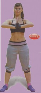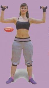 И. п.: стоя, ноги на ширине плеч, руки подняты и разведены в стороны под прямым углом, в руках гантели или бутылки с водой (фото 3).