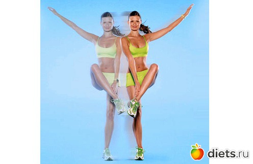Как выполнять упражнение: начальная позиция - стоя на полу, ноги на ширине плеч, руки подняты над головой и разведены в стороны. Поднимите вверх согнутую в колене правую ногу - так, чтобы вы могли коснуться ее стопы опущенной левой рукой. Правую руку продолжайте держать поднятой над головой. Поменяйте ноги. Теперь постарайтесь правой рукой дотронуться до правой стопы. Не останавливаясь, выполняйте упражнение в течение одной минуты.