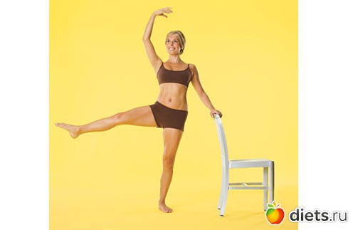 Как выполнять упражнение: встаньте слева от спинки стула, ноги держите вместе. Поднимите вверх слегка согнутую в локте правую руку. Держите спину прямо. После этого медленно поднимите вверх правую ногу (как показано на фотографии) и, стараясь держать ее выпрямленной, нарисуйте в воздухе десять небольших окружностей - сперва поворачивая ногу по часовой стрелке, затем против часовой. Повернитесь к стулу другим боком. Повторите упражнение.