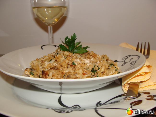 Можно подавать отдельным блюдом или как гарнир к птице или рыбе. При подаче присыпать немного пармезаном и украсить петрушкой. Если есть повод, можно запивать сухим белым вином.