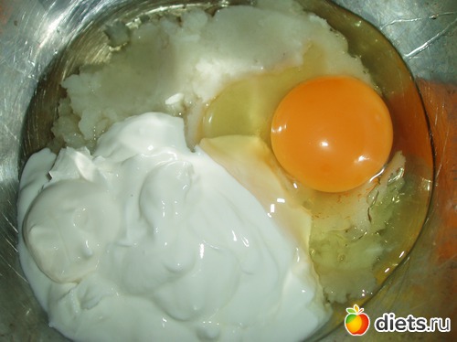 Смешать картофельное пюре со сметаной, маслом и яйцом.