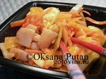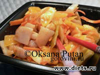 Очень часто в приготовлении различных блюд целую тушку кальмара я нарезаю ровными кольцами. Но при этом, остается ещё очень много различных обрезков – это треугольный хвост, и порванные части тушки. Все эти ’лишние’ части можно и нужно использовать для приготовления салата. Например, такого, очень уместного к постному столу. Капусту порежьте квадратами, морковь – тонкой соломкой. Выложите в глубокую посуду, Добавьте приправу, сахар и соль. Хорошо размешайте, разминая руками.