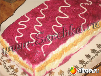 Накрываем пищевой пленкой и на пару часов в холодильник. Потом переворачиваем аккуратно на плоское блюдо. И украшаем, конечно, только я не успела... Но даже без украшения салата был очень вкусный рецепт, и я точно знаю, какую шубу буду делать на Новый год!