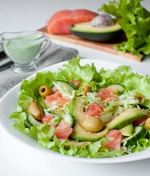 Авокадо разрезаем пополам, удаляем косточку, счищаем кожуру, мякоть нарезаем тонкими ломтиками. Сбрызгиваем лимонным соком, чтобы не потемнели.
